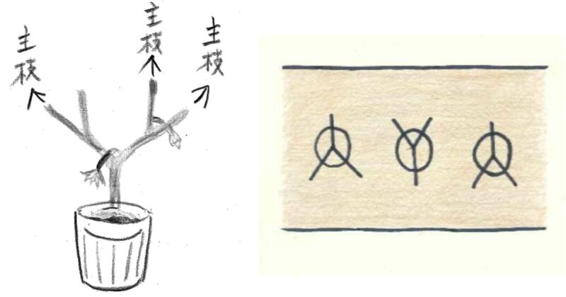・主枝が2本しかない場合は、主枝から出ている一番良い側枝を3本目の主枝とする。