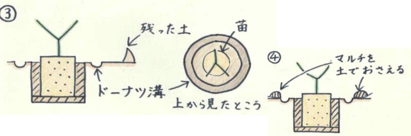 ・活着するまでの潅水は、株元ではなくドーナツ溝に手潅水で行う。