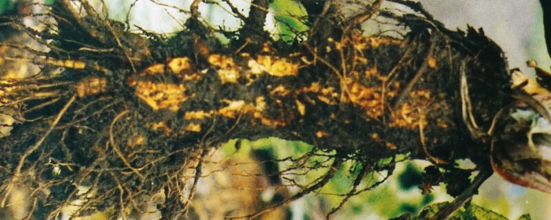 「白絹病」が発生しやすいので、予防のため「石灰質資材」を株元に施用しておく。管理機を使用して中耕培土する時は、根があまり再生しないうちに実施する。